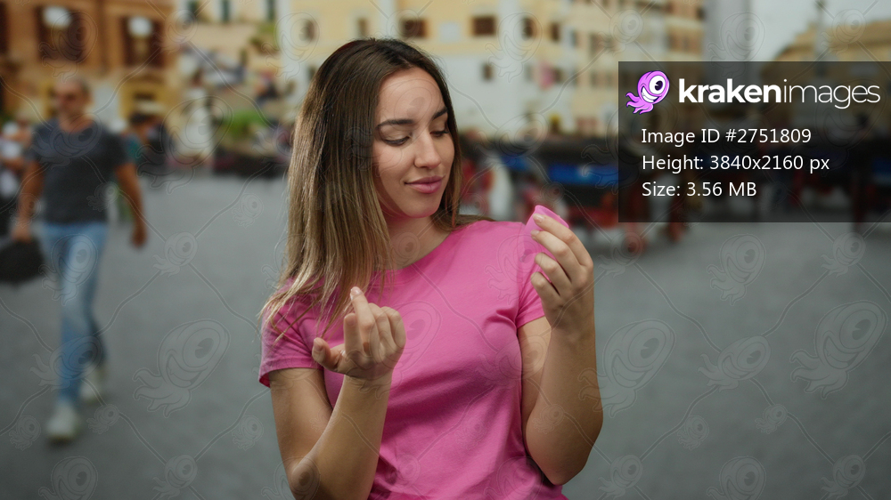 Blonde woman in pink shirt examines menstrual cup on a lively urban street, with people walking in the background, highlighting health awareness outdoors. - Kraken Images