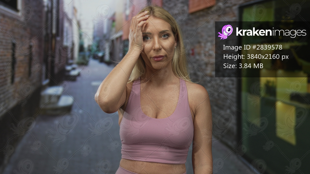 Blonde woman in pink sports bra touches forehead with hand in street beside brick buildings under soft daylight; introspection.