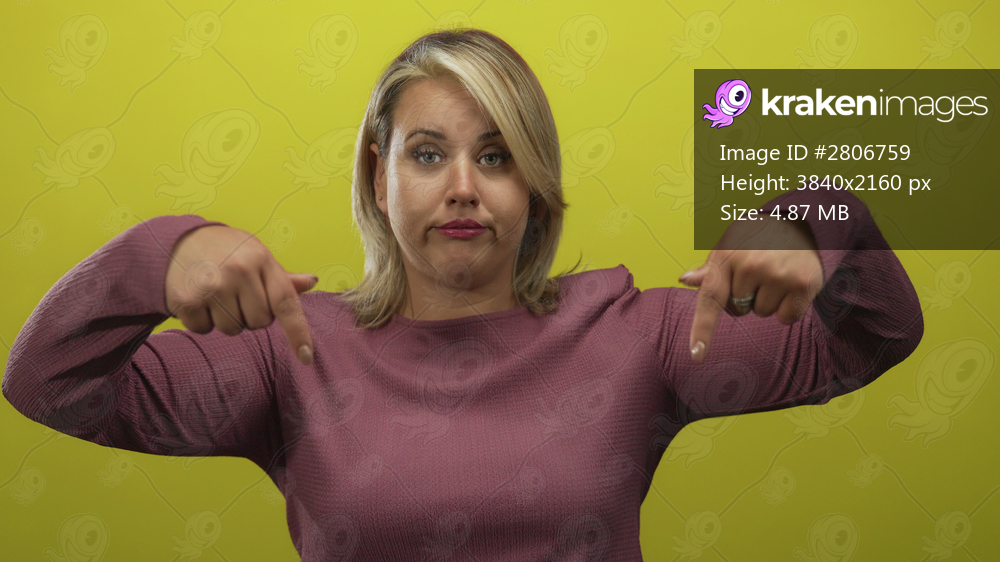 Blonde woman in purple sweater standing straight pointing fingers downward in studio; confidence emphasis.