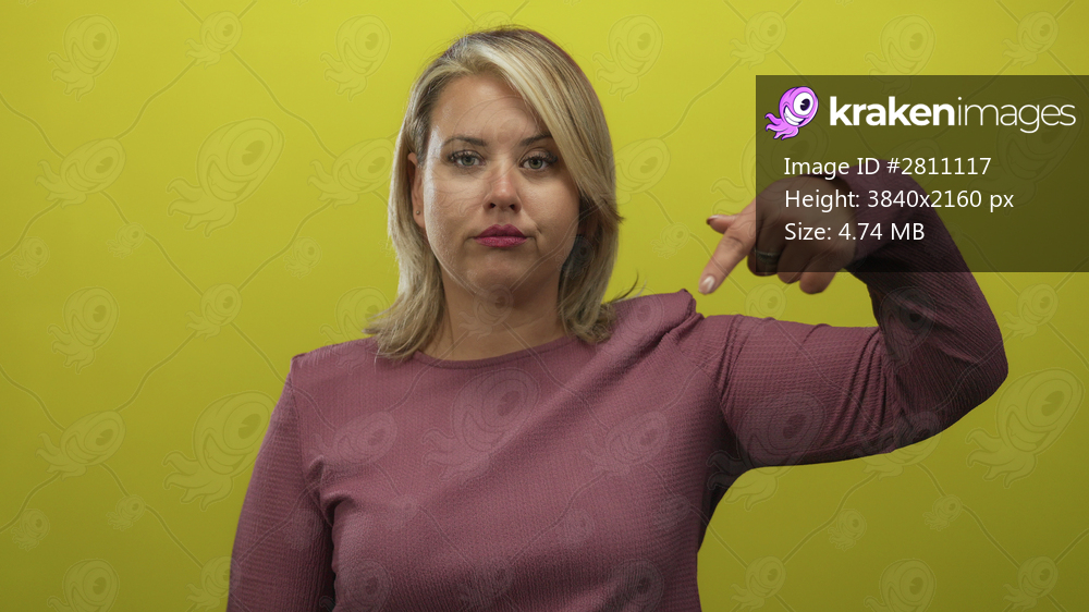 Blonde woman in purple sweater standing straight pointing fingers downward in studio; confidence emphasis.