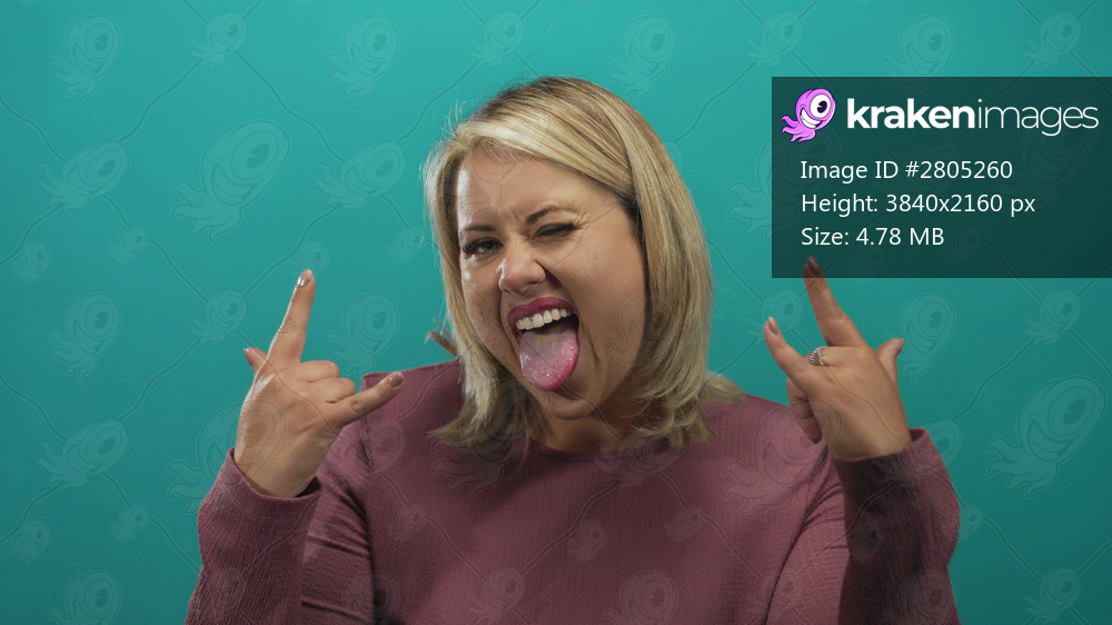 Blonde woman in purple top making rock horns gesture, winking and sticking out tongue in studio; rock metal fun.