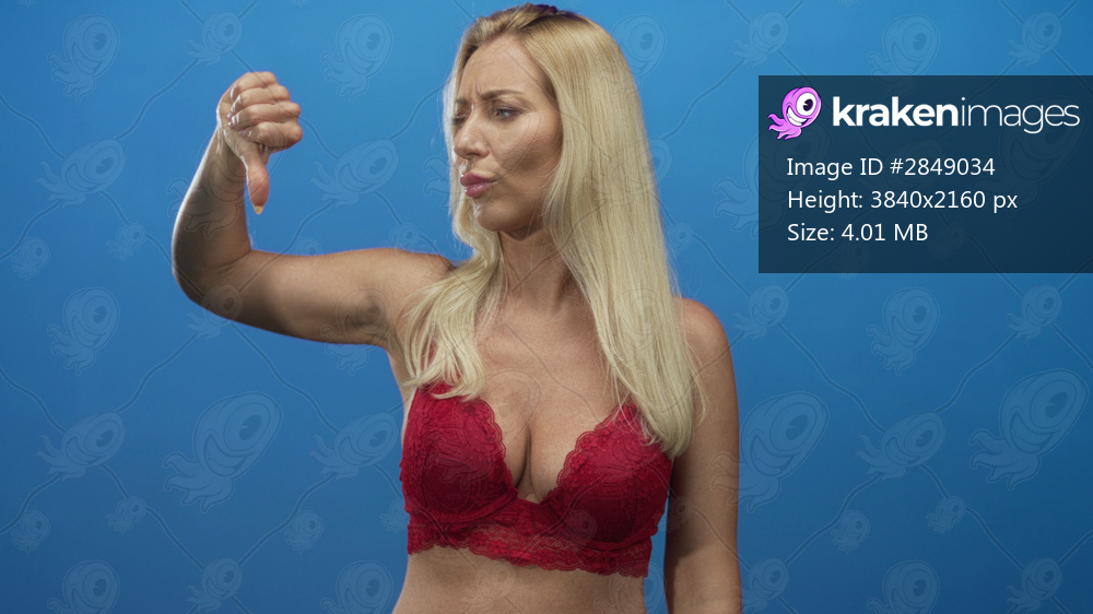 Blonde woman in red lace bra displays thumbs down gesture showing visible cleavage in studio; rejection.