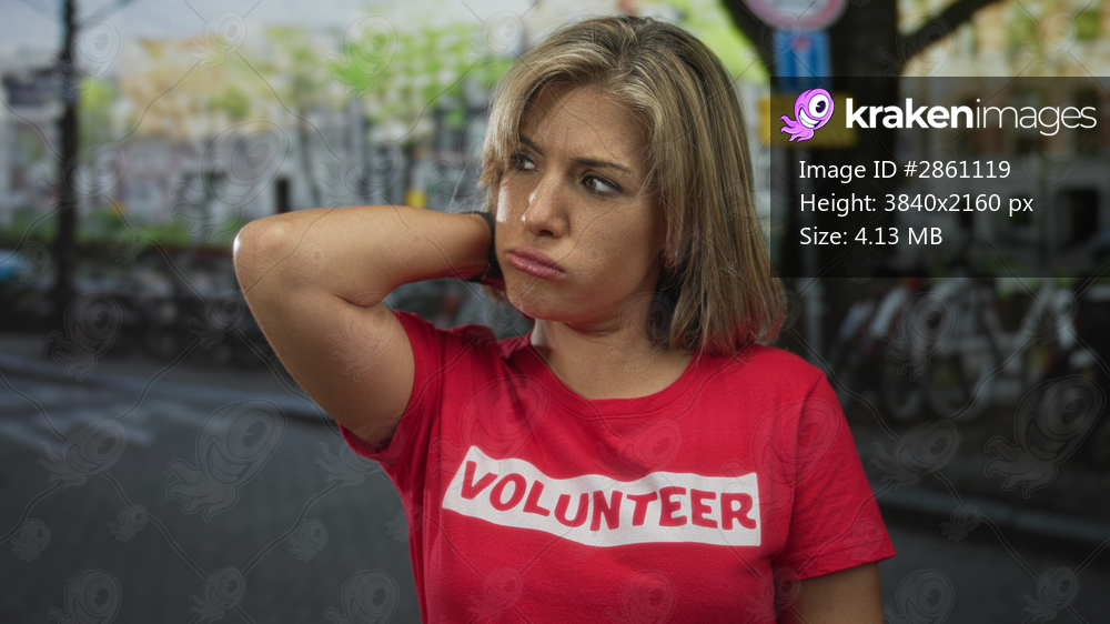 Blonde woman in red volunteer shirt holds hand on neck amid parked bicycles on urban street; discomfort.