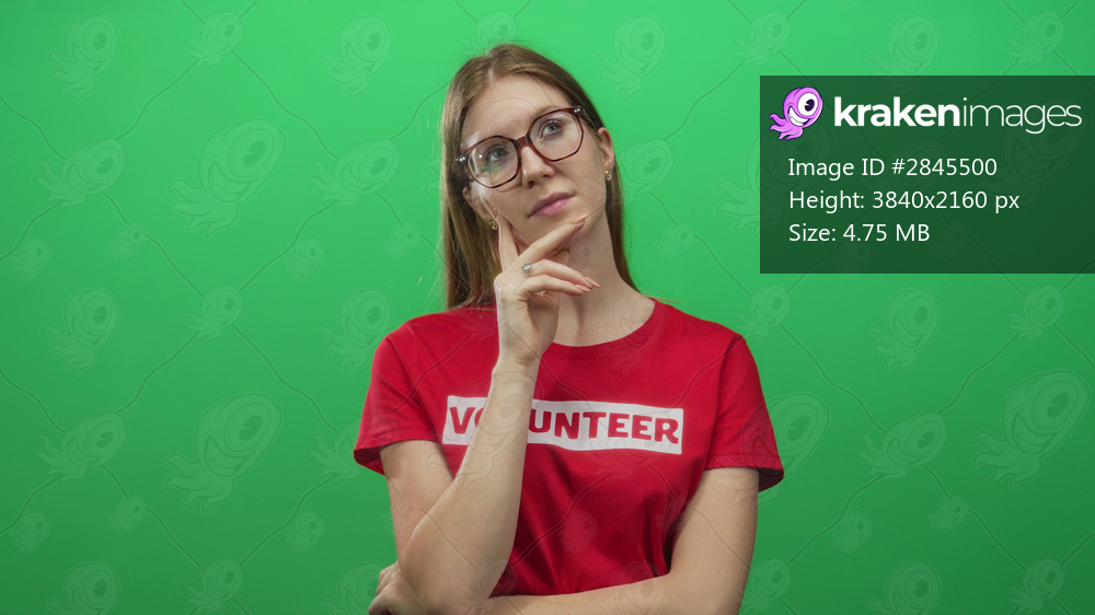 Blonde woman in red volunteer shirt wearing glasses with hand on chin against green backdrop in studio; reflection.
