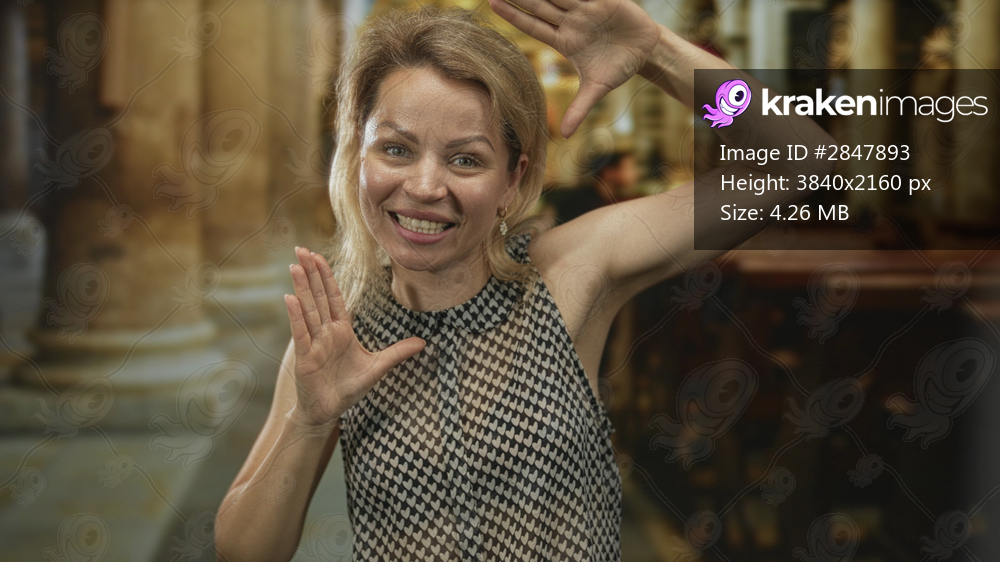 Blonde woman in sleeveless dress smiling frames face with hands in church building; spiritual joy hope faith.
