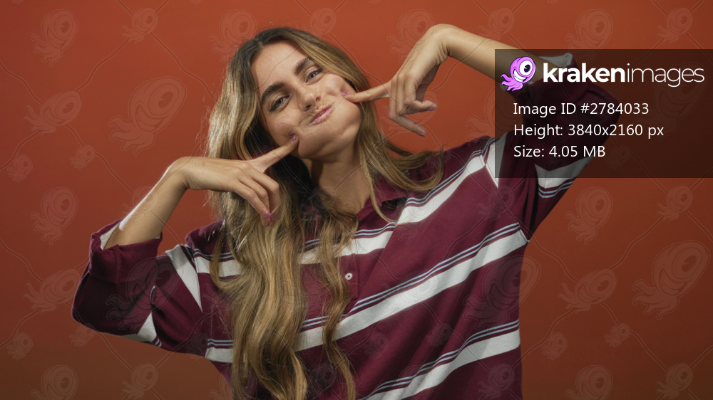 Blonde woman in striped shirt presses her cheeks with fingers in a photo studio; playfulness joy humor youth.