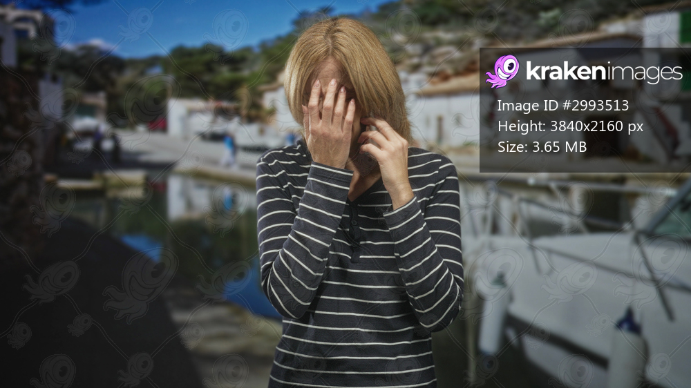 Blonde woman in striped top holding smartphone to ear while covering her face with one hand on street by marina; anxiety.