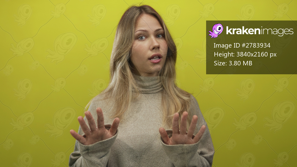 Blonde woman in turtleneck sweater raises palms for stop gesture facing camera in a studio; caution hesitation concern.