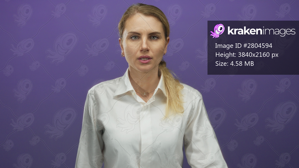 Blonde woman in white shirt with hand on forehead expresses frustration against clear purple background.