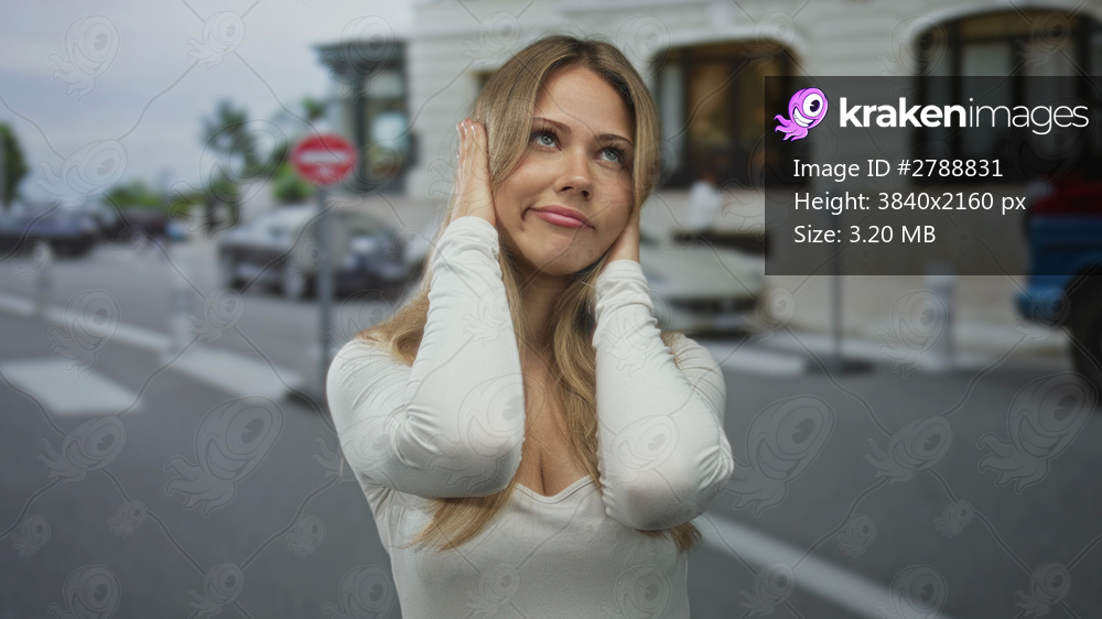 Blonde woman in white top covers ears with hands on a busy urban street crosswalk; annoyance frustration.