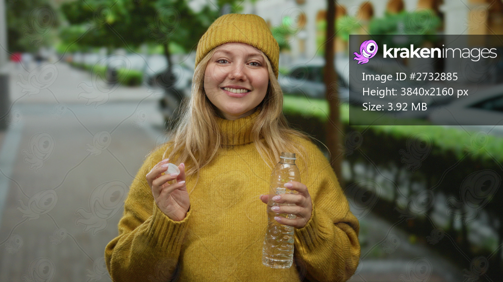 Blonde woman in yellow sweater smiles while holding water bottle in city street with greenery and cars in background.