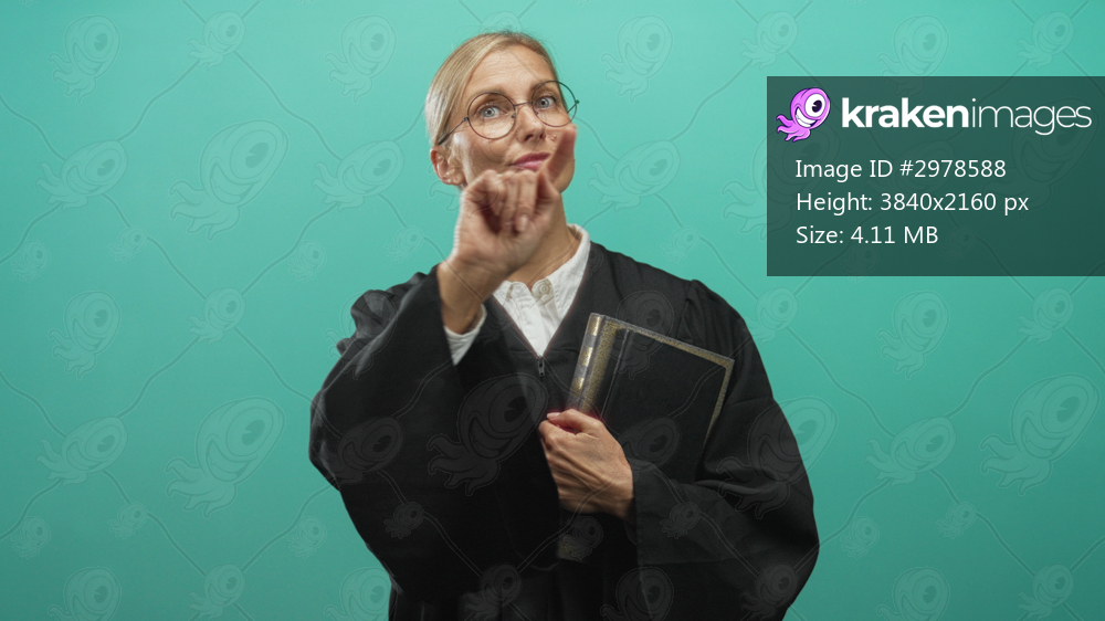 Blonde woman judge in robe holds a hardcover law book to her chest and points index finger forward in teal studio; authority.
