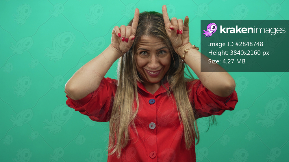 Blonde woman with long hair pointing index fingers upward in studio against bright green wall; mischief.