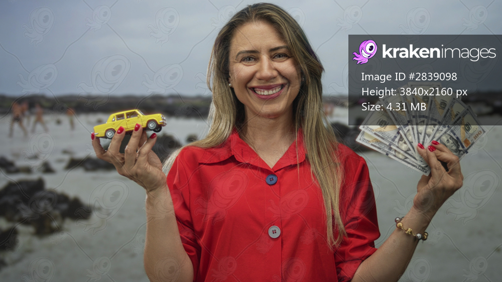 Blonde woman with long hair smiles and holds yellow toy car and fan of cash bills at street; confidence.