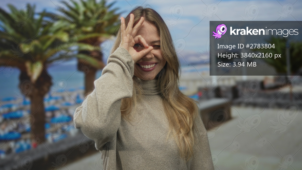 Blonde woman makes ok sign with hand around eye at beach with palm trees and umbrellas behind; playfulness joy positivity.