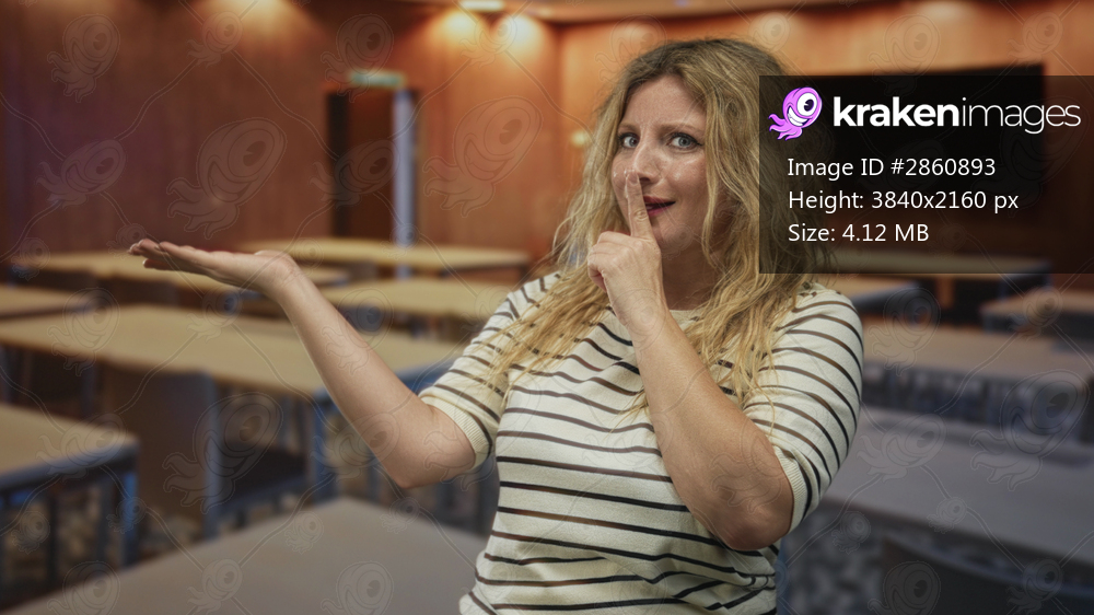 Blonde woman making finger to lips for silence in classroom building while holding one hand raised in a pointing gesture; playful secrecy.