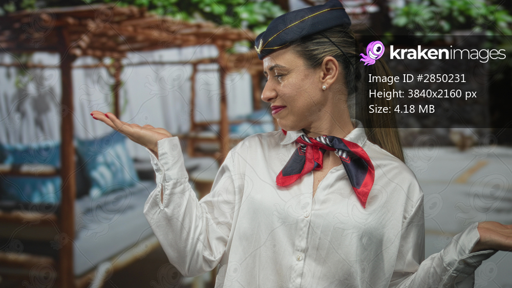 Blonde woman offers palm up outside building while wearing flight cap and white shirt and smiling; confidence.