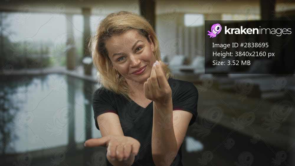 Blonde woman with open palms making a begging gesture by indoor pool in a building spa; desperation plea.