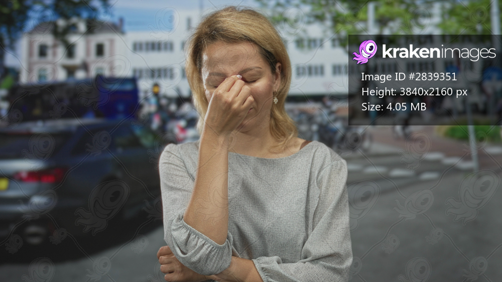 Blonde woman pinches nose and closes eyes on busy city street beside parked car and bicycle lane; disgust.