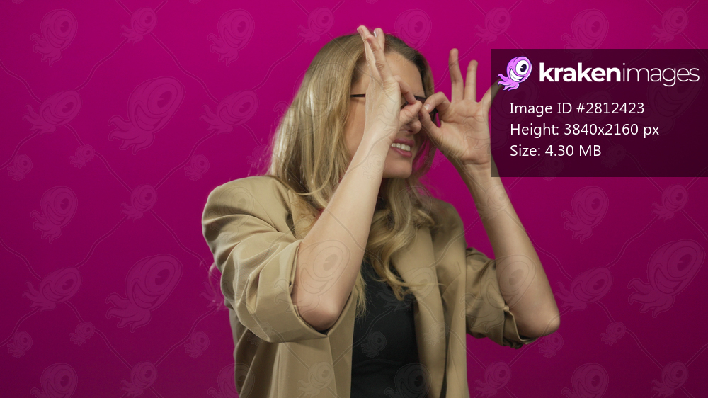 Blonde woman playfully gestures glasses with her hands, smiling against a vibrant pink background, wearing a beige blazer and expressing fun and joy in an isolated studio setting. - Kraken Images
