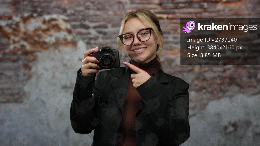 Blonde woman pointing at camera with a smile against a brick wall background wearing glasses and a black blazer.