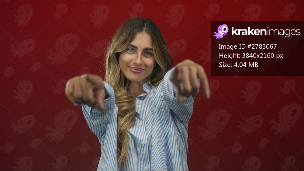 Blonde woman pointing both index fingers toward camera in a photo studio; invitation welcome connection.