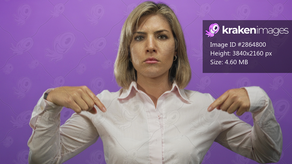 Blonde woman pointing finger at her light pink shirt button in a bright purple studio set; confidence.
