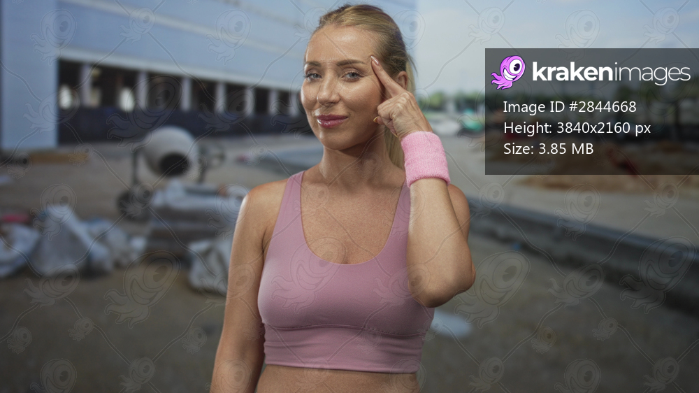 Blonde woman pointing finger to head at building under construction with scattered tools on ground; thinking.