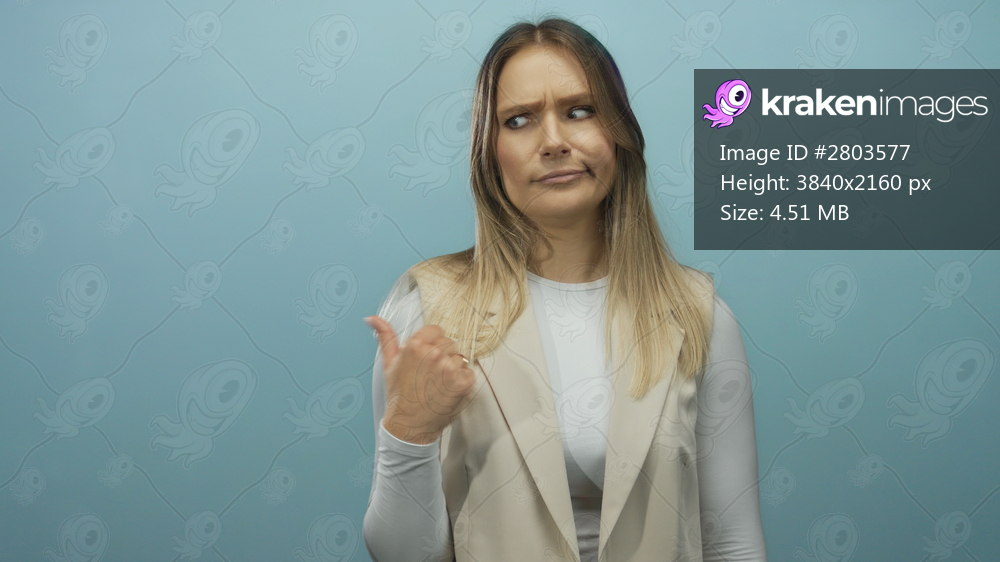 Blonde woman pointing with thumb against a blue background, expressing doubt and curiosity, isolated and casual, wearing white and beige, emphasizing her thoughtful expression. - Kraken Images