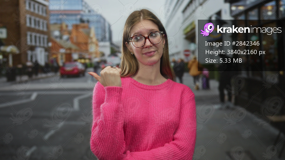 Blonde woman pointing thumb to red brick building in crowded city street during daytime; skepticism doubt.