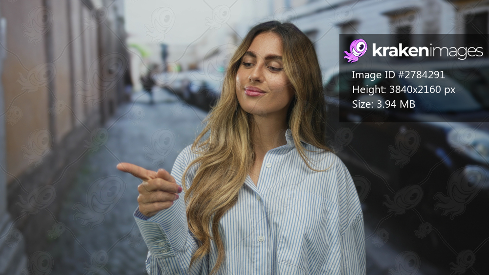 Blonde woman points finger on historic cobblestone street downtown; confidence guidance suggestion decision.