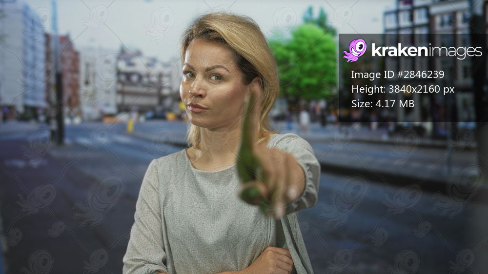 Blonde woman points her finger forward at busy city street intersection wearing gray blouse; bold confidence.