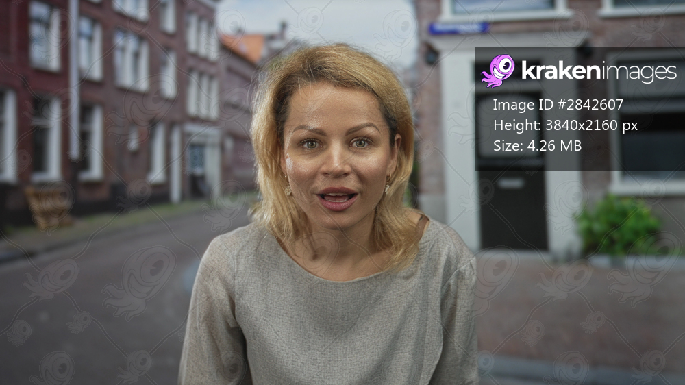 Blonde woman pressing hands to cheeks with open mouth on narrow urban street lined with brick houses; surprise.