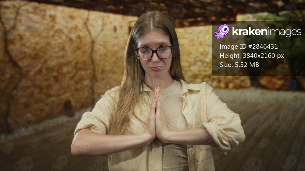 Blonde woman pressing hands together in a rustic studio building with wooden floor and stone walls; hope serenity calm.