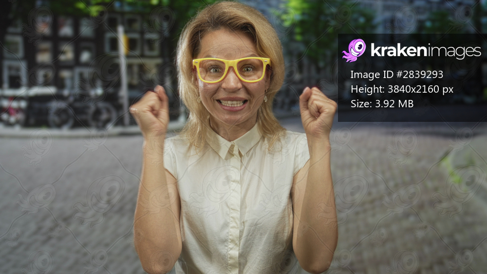 Blonde woman raises fists wearing yellow glasses and smiling on cobblestone street lined with bicycles; excitement.
