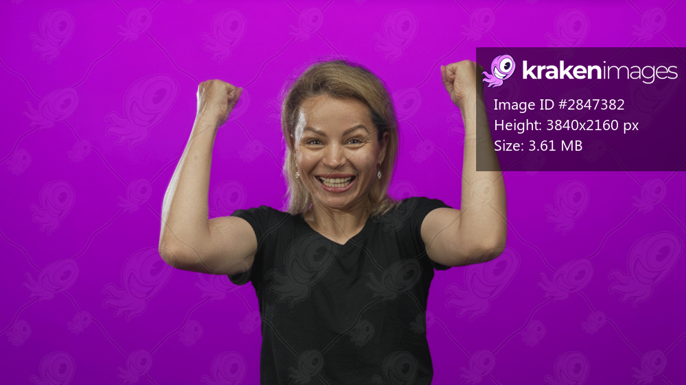 Blonde woman raising clenched fists in vibrant purple studio for victory gesture; joy celebration success.