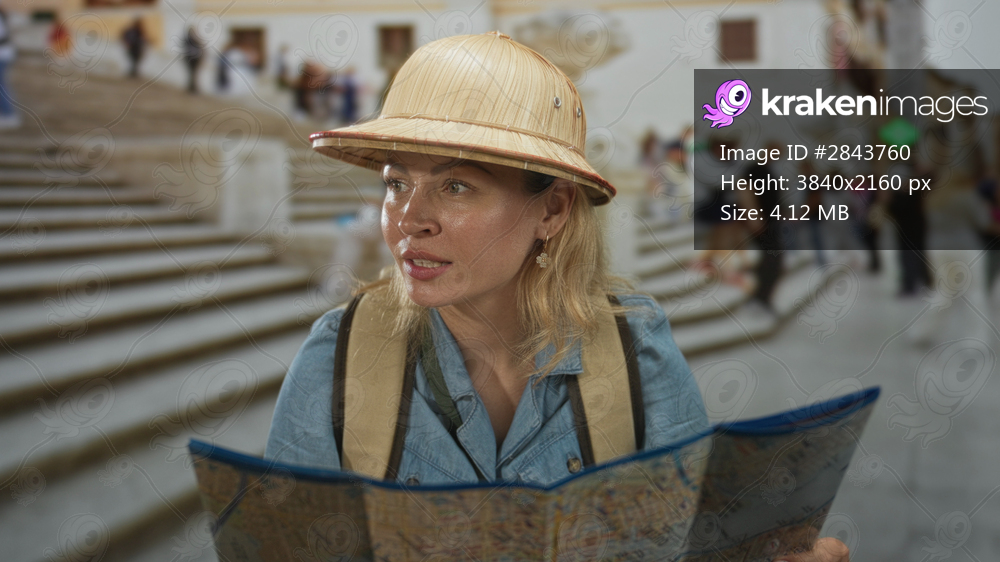Blonde woman reading map in front of building stairs while wearing backpack and hat; curiosity adventure discovery.