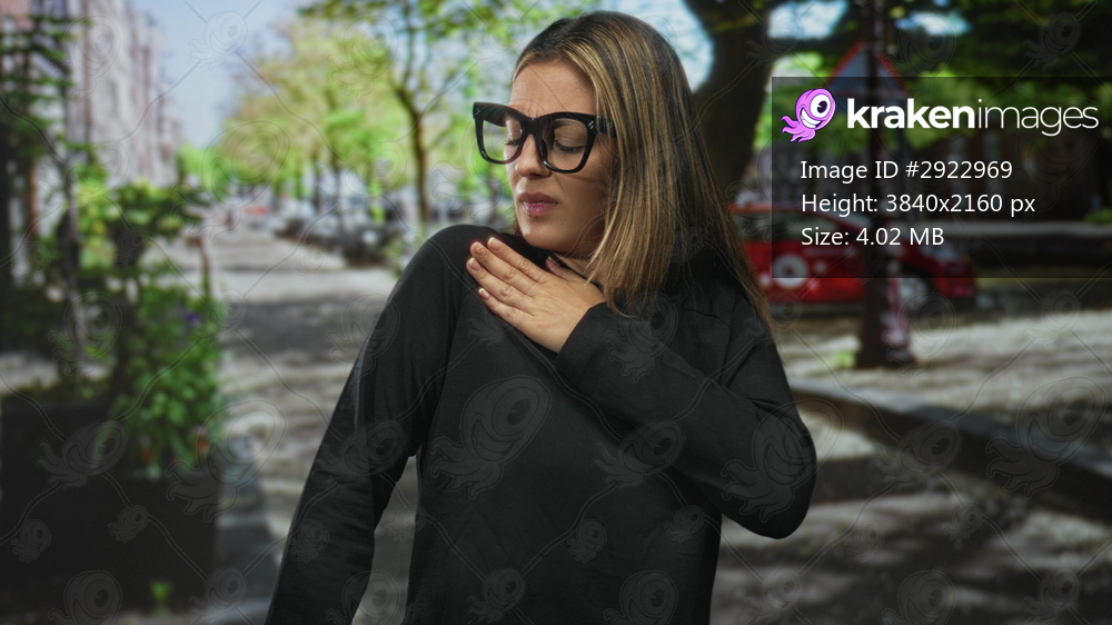 Blonde woman rubbing her shoulder on a leafy street wearing dark top and glasses near a parked car and planter for backache; discomfort.