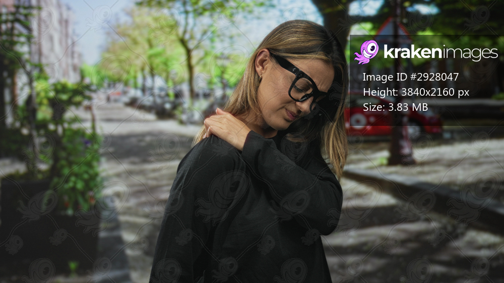 Blonde woman rubbing her shoulder on a leafy street wearing dark top and glasses near a parked car and planter for backache; discomfort.