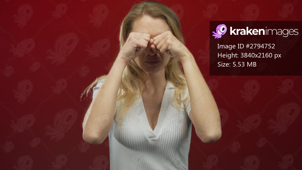 Blonde woman rubs eyes against vivid red background expressing emotion in an isolated studio setting.
