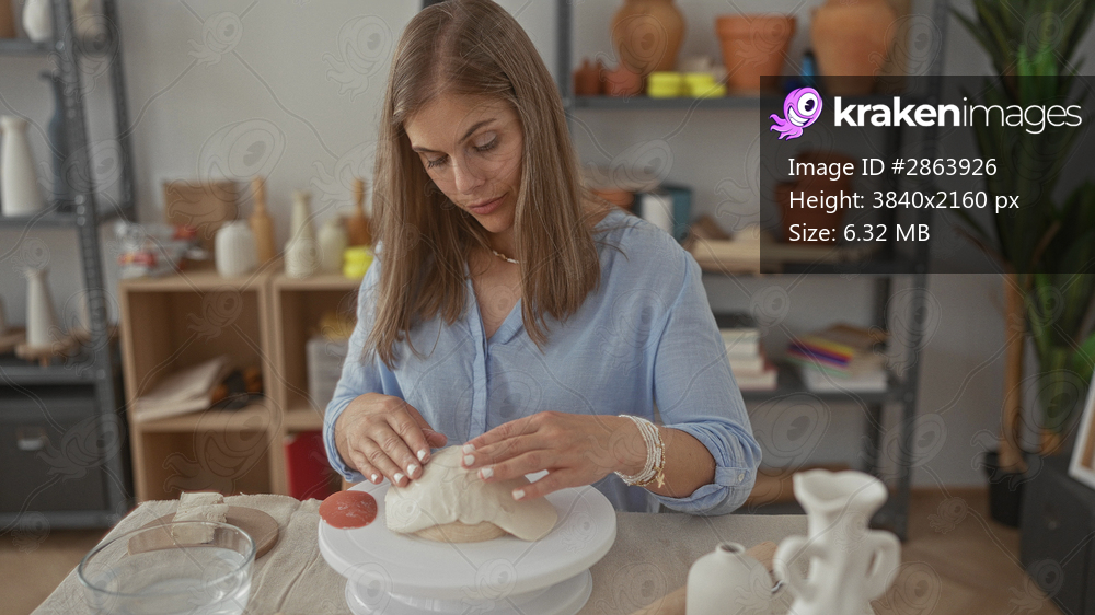 Blonde woman sculpts a ceramic vessel with her hands on a spinning pottery wheel in a studio; serenity.