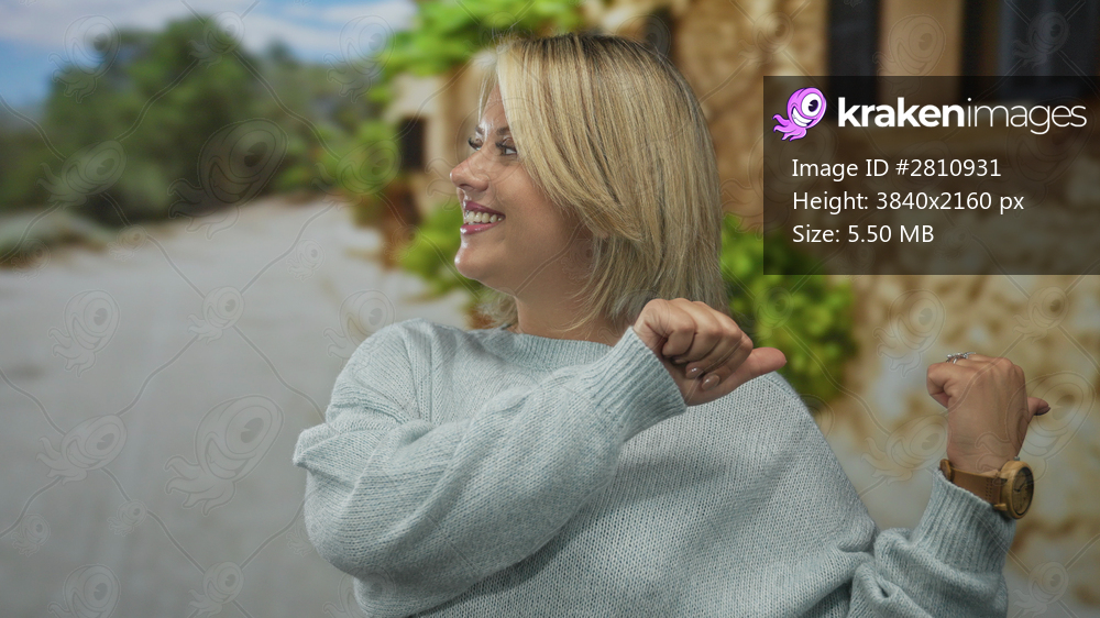 Blonde woman showing a thumbs up gesture outside a sunlit stone building on an old town street; approval.