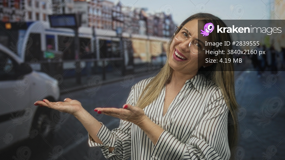 Blonde woman showing open palms on a busy urban street near a tram stop with passing passengers; openness.