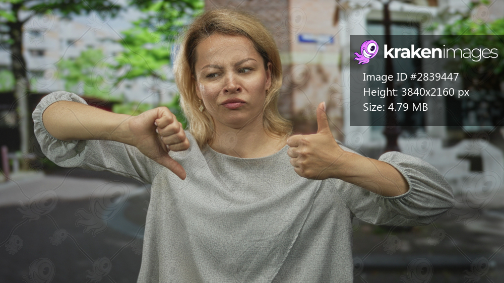 Blonde woman shows both thumbs up and thumbs down gestures on urban street setting; inner uncertainty.