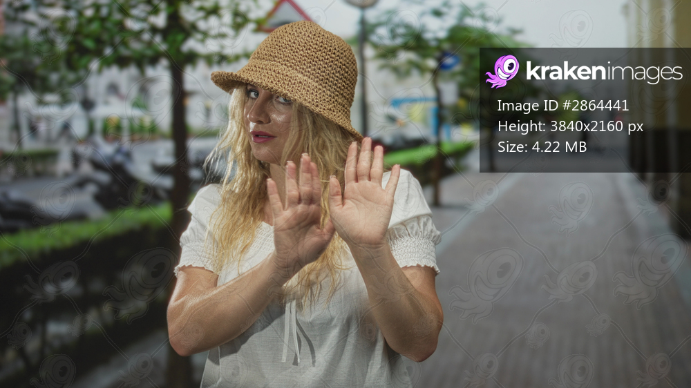 Blonde woman shows palms raised in a stop gesture on a city street wearing a straw hat and white blouse; refusal.