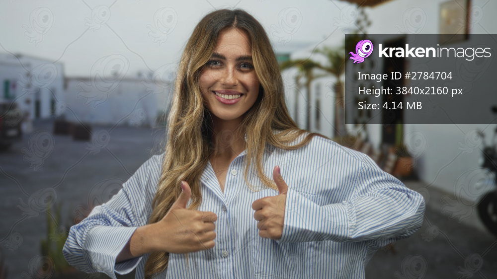 Blonde woman shows thumbs up gesture with both hands in a rustic courtyard cafe; approval confidence optimism.