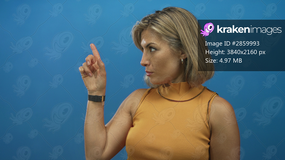 Blonde woman with slender finger pointing to an unseen object in blue studio setting; serious focus.