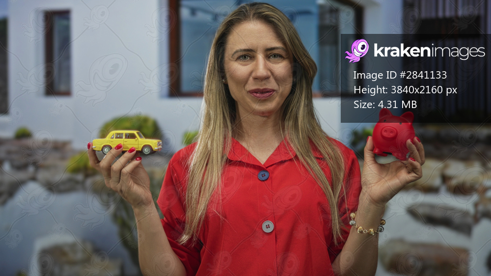 Blonde woman smiles and holds yellow toy car and red piggy bank at house entrance outdoors; confidence.
