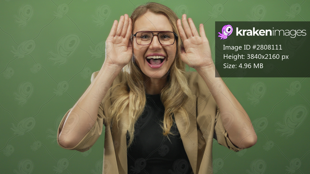 Blonde woman smiles playfully against green background, covering and uncovering her face while wearing glasses and a tan blazer, conveying surprise and joy. - Kraken Images