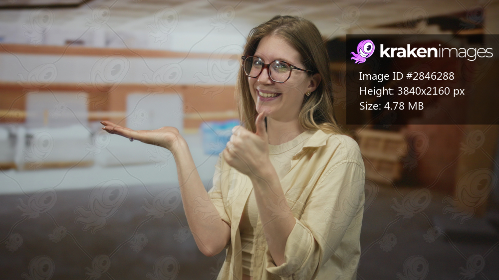 Blonde woman smiles showing face and holds hands palm up beside wooden boards in construction site building interior; happiness.
